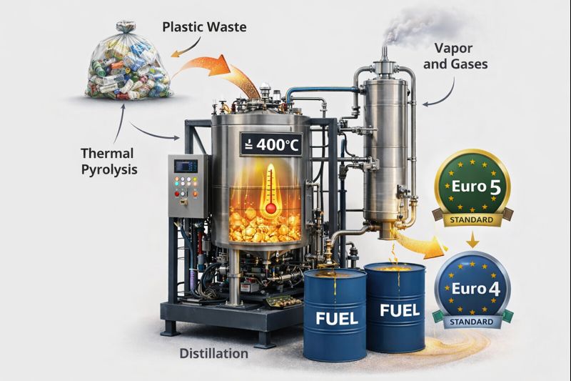 The system operates using a controlled thermal conversion (pyrolysis) process, where plastic waste is processed at temperatures up to 400 °C in an oxygen-free environment. The resulting vapors are condensed and refined into liquid fuel that meets Euro 4 and Euro 5 fuel standards.